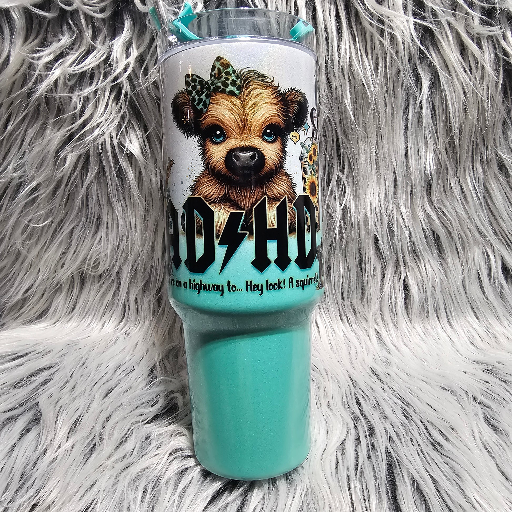 The ADHD “Over Stimulated” design (a cheeky nod to the classic AC/DC logo) meets a mint ombré holographic finish and a chill little Highland calf that’s just as overwhelmed as the rest of us. It’s loud, proud, and downright relatable.