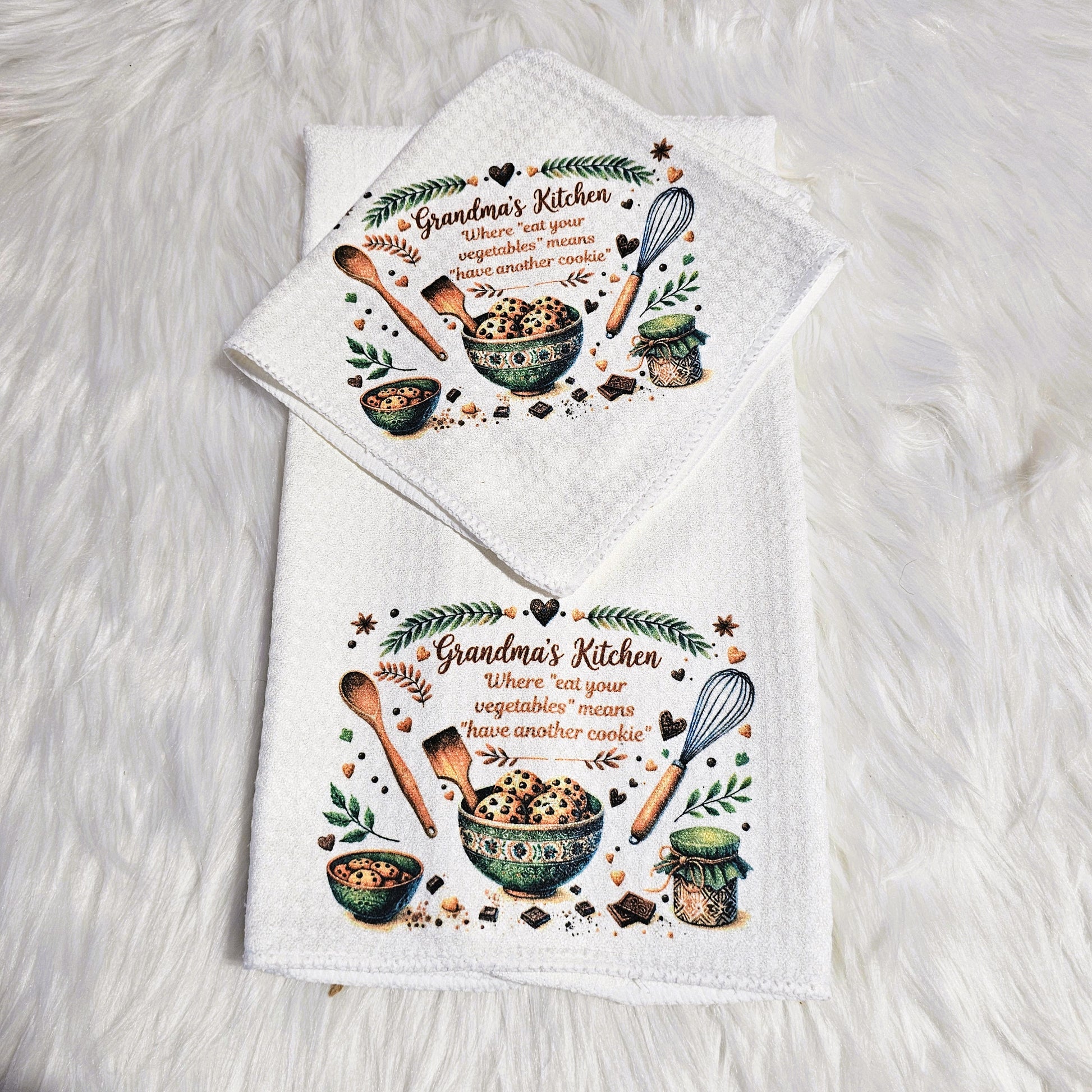Microfiber waffle weave towel & washcloth set — cookies, utensils, and the truth: “Grandma’s kitchen — where eat your vegetables means have another cookie.” Sweet, sarcastic, and sugar-fueled.