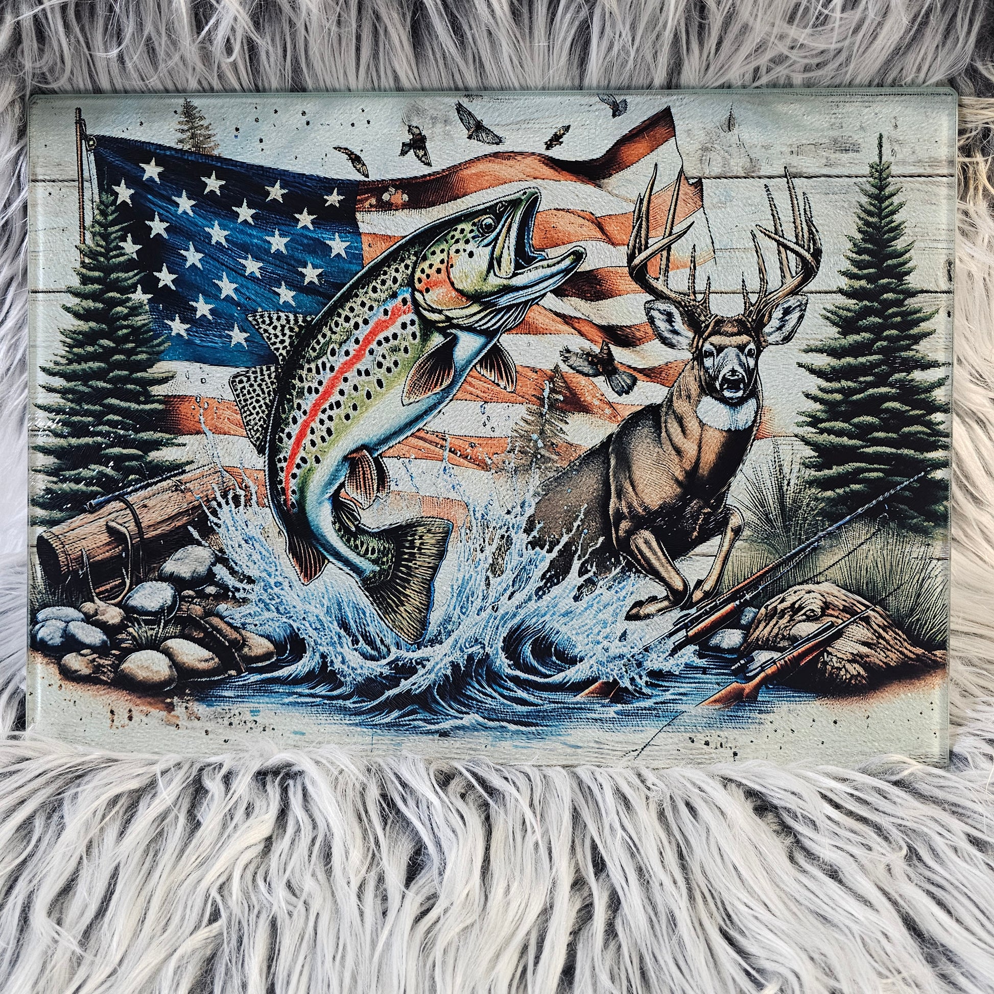 12"x15" glass cutting board — deer, birds, fish, and a proud flag waving in the background. It’s the outdoors, but in your kitchen. Rugged and patriotic.