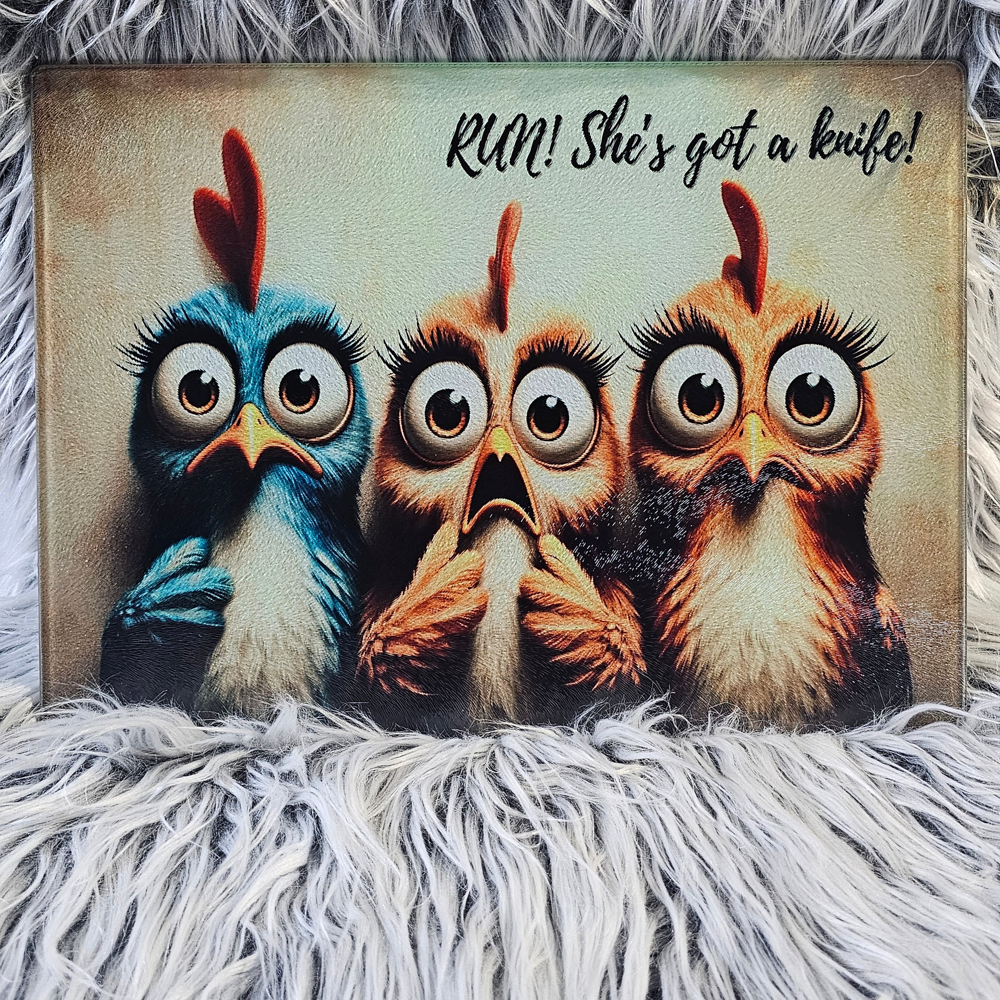 Lg. Rectangle — Three terrified chicks yelling “Run! She’s got a knife!” because someone finally started dinner. Bold, funny, and sharp in all the right ways. The ultimate kitchen conversation starter.