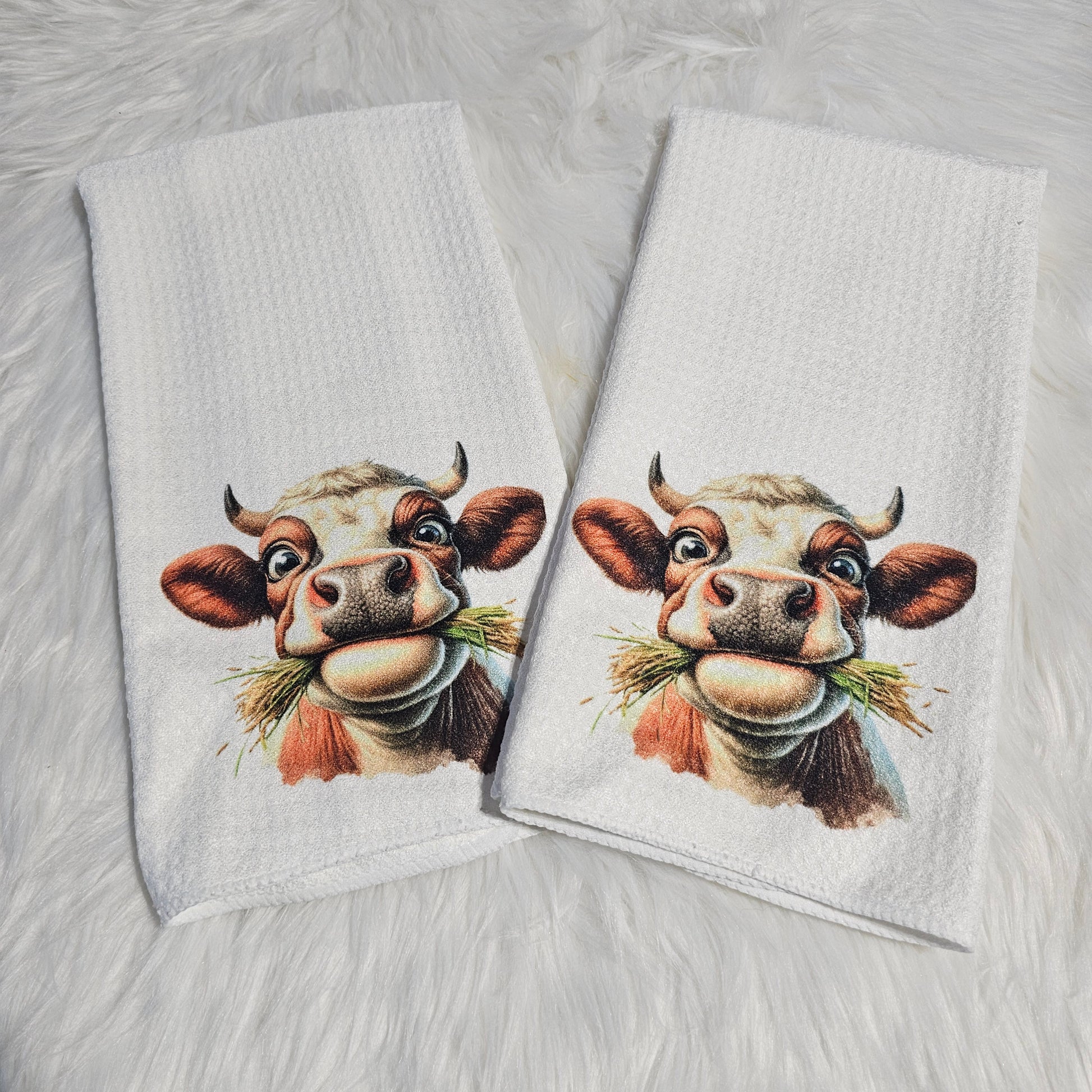 Two microfiber waffle weave towels with a hungry cow mid-chew — hay hangin’, no cares given. Perfect for kitchens that run on caffeine, crumbs, and chaos.