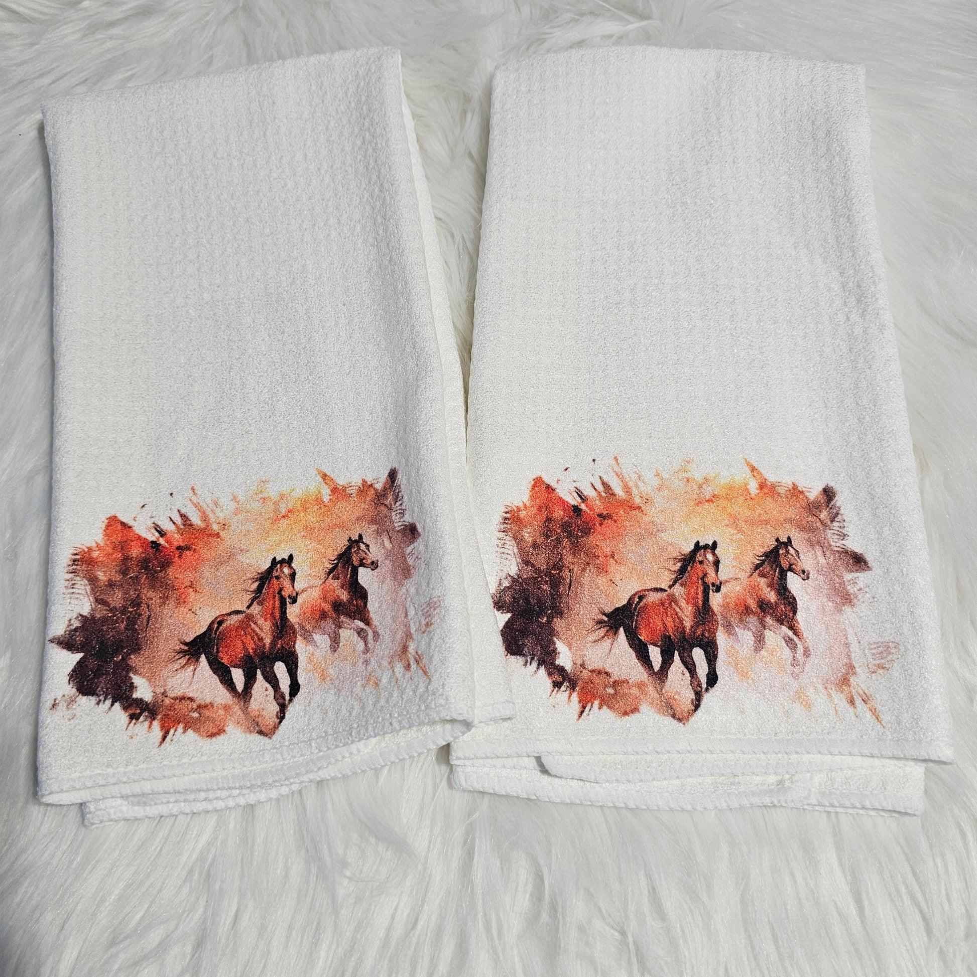 Two microfiber waffle weave towels with running bay horses and splash art — galloping straight into your kitchen like they heard there’s coffee.